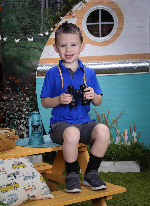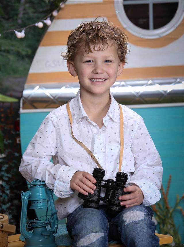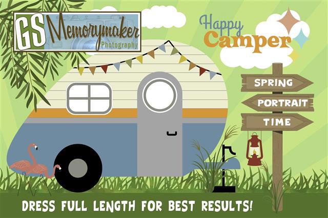 CREATED FOR SCHOOL PORTAITS, "HAPPY CAMPER" REPRESENTS A 1950'S ERA "SHASTA" RETRO STYLE CAMPER PARKED AND READY TO ENJOY THE GREAT OUTDOORS. PINK FLAMINGOS, FISHING POLES, AND A PICNIC TABLE.